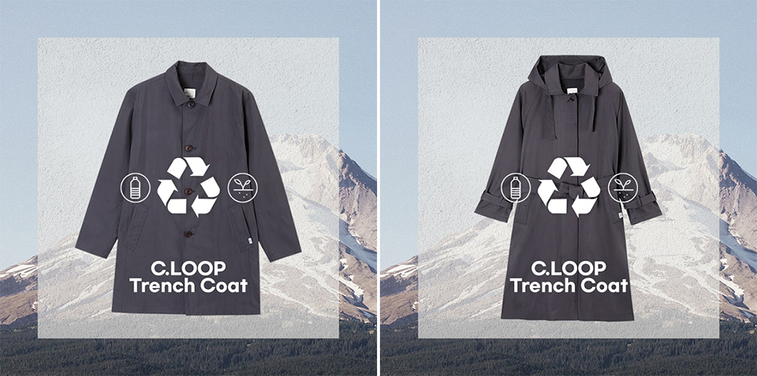 국내 최초로 공개한 생분해 트렌치코트 씨루프 트렌치코트(C.loop Trench Coat)는 스위스 고기능성 소재 브랜드 쉘러(Sheoeller Textil AG)사에서 개발한 생분해 원단으로 제작된 제품으로, 폐 페트병과 산업 폐기물로 만들어진 폴리에스터 원단은 생분해가 가능해 제품 폐기 시 토양에 묻으면 자연적으로 분해가 된다. 여기에 표면제, 광택제 등으로 사용되는 화학 약품인 과불화화합물이 함유되지 않은 친환경 발수제(PFC Free)를 적용해 환경에 미치는 영향을 최소화했고, 야자열매를 압축한 너트 단추를 사용하는 등 모든 제조 과정에서 생분해가 가능하도록 제작했다.