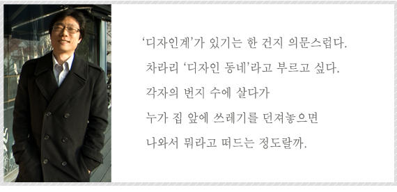 지금 상황을 보면 ‘디자인계’가 있기는 한 건지 의문스럽다. 국가가 국민의 의미를 자의적으로 왜곡해서 "국민이 원하기 때문에”라고 말하며 정책을 집행하듯, 오래 쌓아온 디자인에 대한 개념을 누군가 함부로 곡해해서 쓸 때 속된 말로 ‘맞장 뜰’ 조직이 전무하다. 영화계만 보더라도 스크린쿼터 문제와 같이 영화의 어떤 순수한 개념이 함부로 다뤄지면 응집된 목소리가 터져나오지 않는가. 하지만 한국 디자인에는 그것이 없다. 차라리 디자인 동네라고 부르고 싶다. 각자의 번지 수에 살다가 누가 집 앞에 쓰레기를 던져놓으면 나와서 뭐라고 떠드는 정도랄까. 아무래도 자체적인 비즈니스 역량을 갖추고 있기 때문에 그간 공통의 시스템을 만드는 데 소홀했던 게 아닌가 싶다.