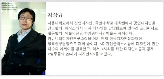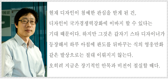 한국 디자인은 요란하고 빠르게 돌아갈 뿐, 원칙에 대한 고민이 없다고 본다. “그러고 나면 어떻게 할 건가”라고 질문했을 때 100명이 모두 “난 성공하고 싶다”고 말한다면 좀 곤란하지 않은가. 게다가 그 중심에는 디자이너가 없다. 이를테면 디자이너의 행사인데 개막식에서 디자이너의 입장을 제한하는 웃지 못할 해프닝이 벌어지고 있다. 북치고 장구칠 때 따라 춤추고 있는 판국이랄까. 물론 가볍게 멀리 뛰는 것도 나쁘지 않다. 하지만 그것과 대구를 이루는, 진지하고 집요한 태도가 필요하다는 생각이다.